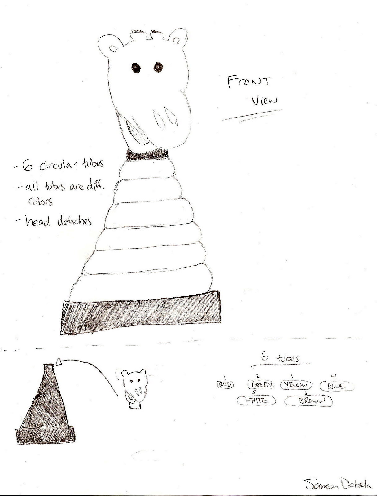 This toy is intended for young toddlers from ages 1-5 to explore different colors and shapes. The circular donut tubes are all different shapes and colors used are red, yellow, green, blue, white, and brown. The head of the toy is able to detach which allows the tubes to fall out and mix up. This allows the child to build the toy back to its original stature by placing the correct size tubes on the cone. I feel that the toy would be boring for children after the age of 5 because the toy does not move. This toy can also spin-off and create various different toys by using different animal heads. Because of its plastic content, the toy is extremely safe.